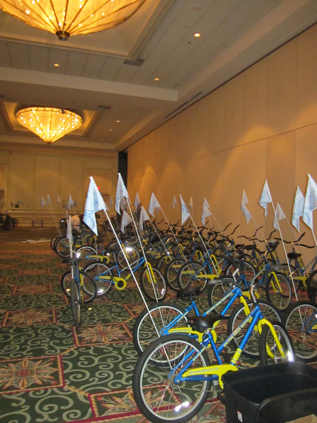 SU did rent bikes for us to use as we wished. We found out that 150 demos had earned the trip, and they all brought someone….so 300 of us descended upon the Westin. They had a conference room full of bikes. And each one had a SU flag on it. Chris was a good egg and sported his dork flag proudly. They also had the BEST cookies and desserts ….with milk!…for after our rides. The beach is quite large and very hard packed, so it’s a cinch to ride bikes on the beach for miles.