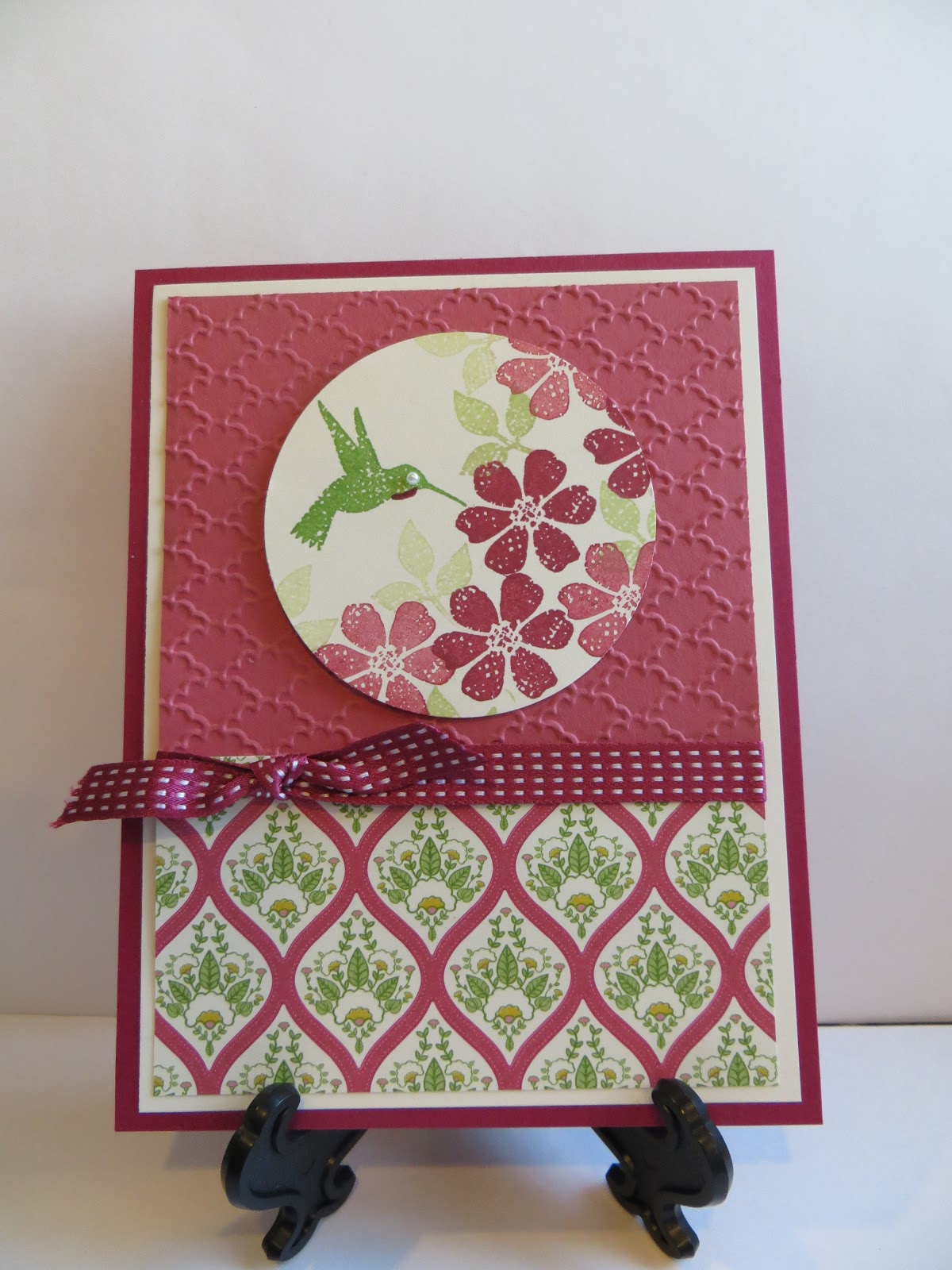 accessories: fancy fan embossing folder, 2 1/2 inch circle punch, raspberry ripple satin ribbon, poetry of prints designer paper stack