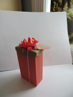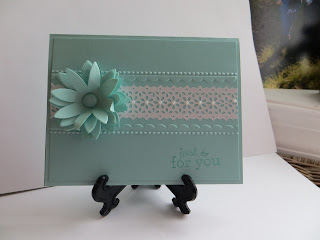 She gave each of us the Pop Up Posies Designer Kit….it can be found on page 18 of your Spring Mini.  It comes with the “Just for You” stamp, 9 embossed paper tags, 9 fabric covered brads, pre cut paper flowers in Pool Party and Calypso Coral and 9 pieces of thick Baker’s Twine.  It’s a super cute kit and sells for only $12.95….but hurry, it’s retiring at the end of this month!