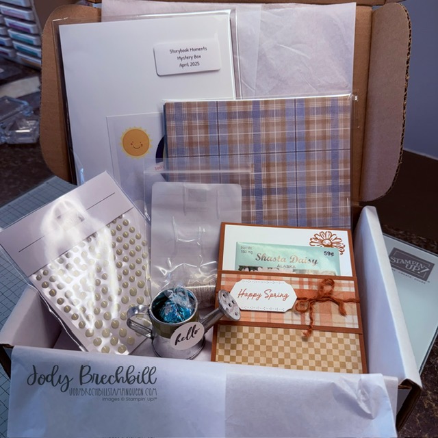 Now, you may be wondering….what’s a Mystery Box? Well, it’s a box of fun that arrives to your door! It includes super fun projects, some Stampin’ Up! products, supplies to create and usually some special fun goodies just for you!